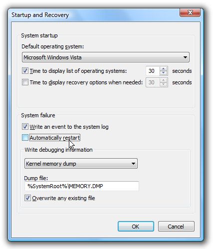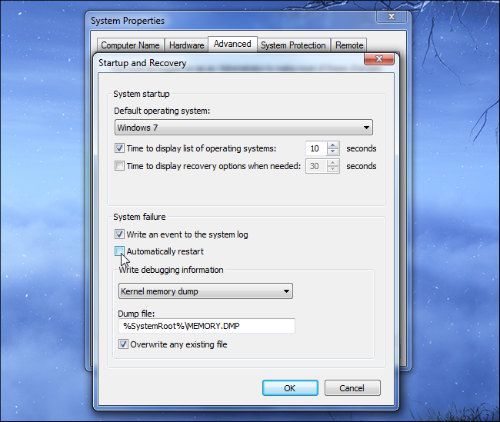 کنترل پنل ویندوز، ریستارت اتوماتیک صفحه آبی مرگ را غیر فعال کنید. برای