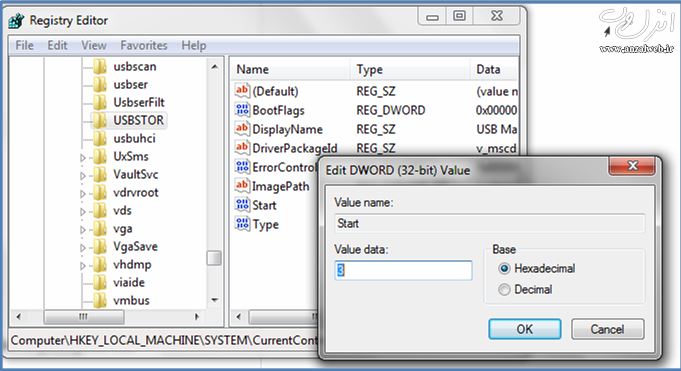 برای فعال نمودن پورت USB مسیر زیر را در ریجستری ویندوز(دکمه Win+R را نگه دارید و در پنجره باز شده regedit راتایپ و اینتر کنید) دنبال کنید: